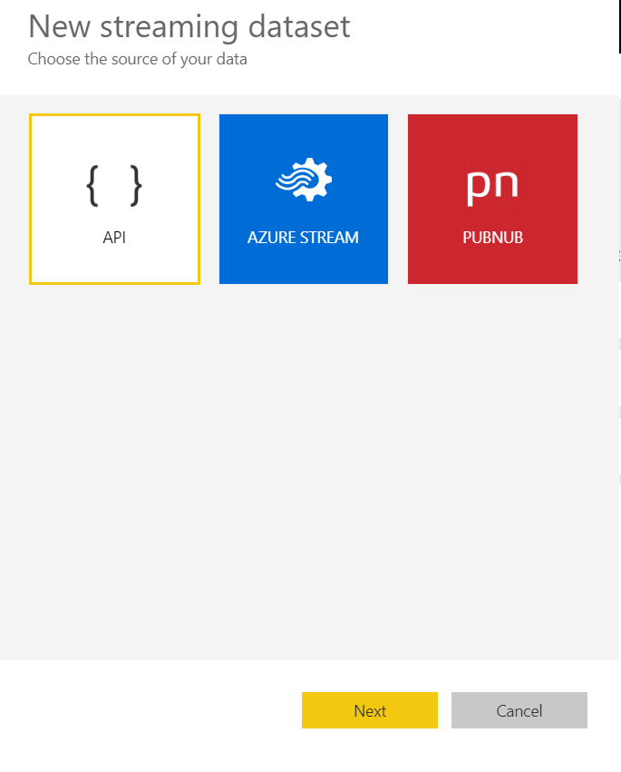 Bunlar Powerbi.com’a doğrudan streamigndatase API oluşturma seçeneği, Azure Stream entegrasyonu seçeneği ve gerçek zamanlı veri sağlayan 3th party bir service sağlayıcısı olan PubNub‘dır.