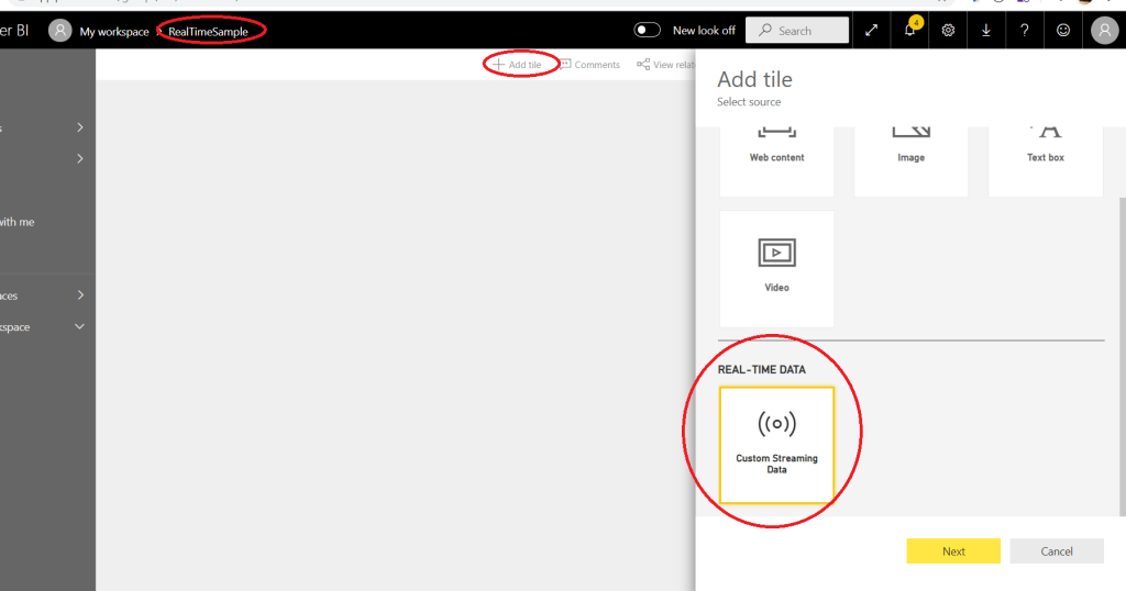 Streaming dataların dashboard (pano) da tile (kutucuk) içinde yaşadığından yukarıda bahsetmiştim. Dolayısıyla çalışma alanıma (workspace) “RealTimeSample” adı altında boş bir dashboard oluşturuyorum. Nasıl oluşturulduğuyla ilgili şu postuma bakabilirsiniz. Dashbordu açtıktan sonra “Add tile” diyip Real-Time Data’yi seçiyorum.