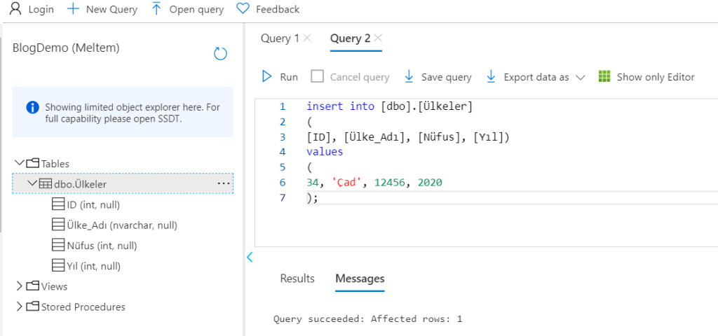 Buradan tablo, view veya stored procedure oluşturabilir, veri girişi yapabilirsiniz. Örnek olarak Ülke isimleri ve nüfus bilgilerini gireceğim bir tablo ve birkaç veri girişi yapacağım. Bunları daha sonra Power BI Desktop’a aktaracağım.