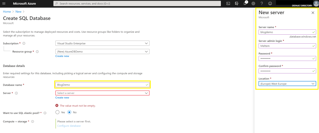 Şimdi sırada veri tabanına isim vermekte ve sunucu oluşturmakta. Ben veritabanına BlogDemo adını verdim. Sunucuma da aynı ismi veriyorum ve sunucumun tam adı blogdemo.database.windows.net şeklinde oluyor. Bir sonraki adımda sunucu admin adı ve şifre işlemlerini tamamladıktan sonra lokasyonumu seçiyorum ve tamam diyorum.
