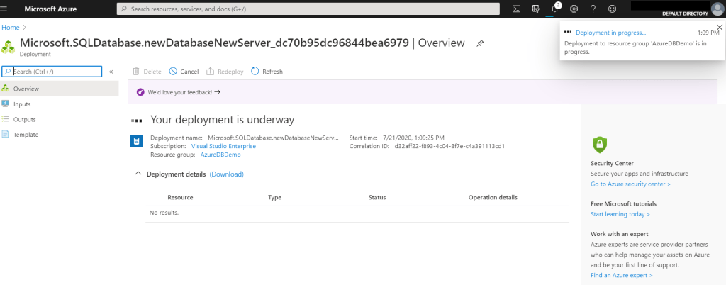 Database’imin boyutunu da belirledikten sonra Create+review dediğimde oluşturacağım veritabanının özelliklerini gösteren bir özet sayfaya ulaşıyorum ve Create dediğimde veritabanım oluşturuluyor.
