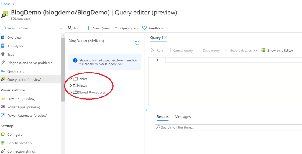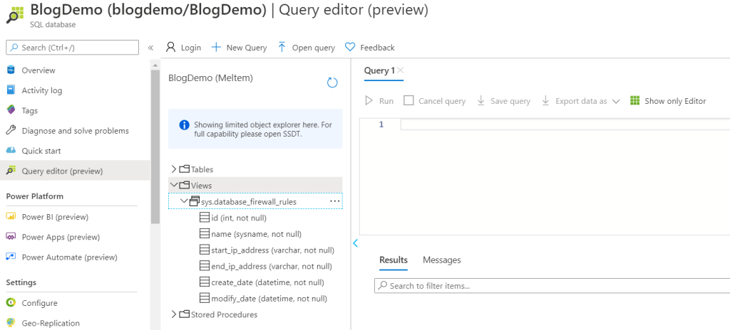 SQL kullanıcılarının alışkın olduğu sayfanın benzerine ulaşıyorum. Tabloların altı boş çünkü şuan için database’im boş ancak views’un altında veritabanınıza erişmek için Azure bulutta yapılandırılan güvenlik duvarı kurallarının view dizisini görürsünüz.