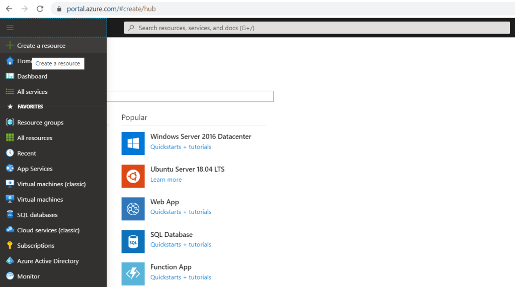 Şimdi Azure Cloud’da Azure SQL Veritabanı kuralım. Bunun için Azure platforma giriş yapıyorum ve ana sayfada Azure’ın sunduğu tüm hizmetleri karşıma çıkıyor. Sol menüden yeni bir kaynak oluşturmak için Create Resource‘u tıklıyorum.