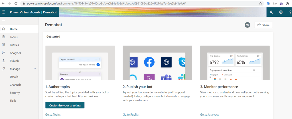 Power Virtual Angents’a bu kanaldan ulaşabilirsiniz. Aşağıdaki açılış sayfası sizi karşılayacak.