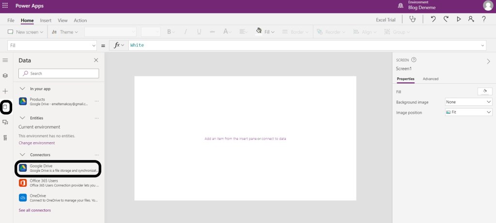 Ardından Power Apps Connector’lere gelip dosyayı yüklediğim bulut hizmetiyle bağlantı kuruyorum ve excel dosyamı Power Apps Studio’ya yüklüyorum. Ben google drive’a yüklemiştim.