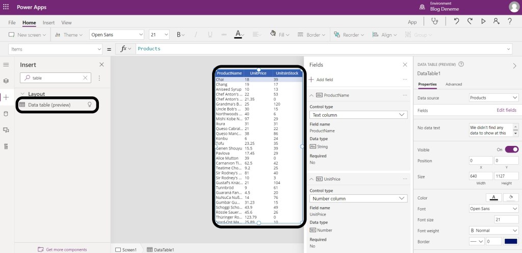 Gördüğünüz gibi exceldeki verilerim şuan Power Apps’de uygulamanın içine gömüldü.
