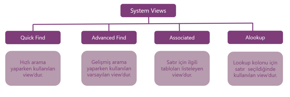 System View, sistem yöneticilerinin görebileceği özel view’lardır. Bu view’lar uygulamanın bağlı olduğu sistem tabloları için vardır veya siz özel tablo oluşturduğunuzda otomatik olarak oluşturulan view’lardır. Bu view’ların Quick find, Advanced find, Associated ve Alookup gibi bazı gelişmiş farklı özellikleri vardır. Bunların neler olduğuna bakalım.