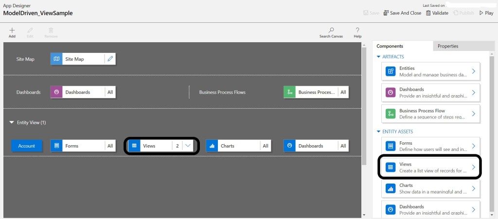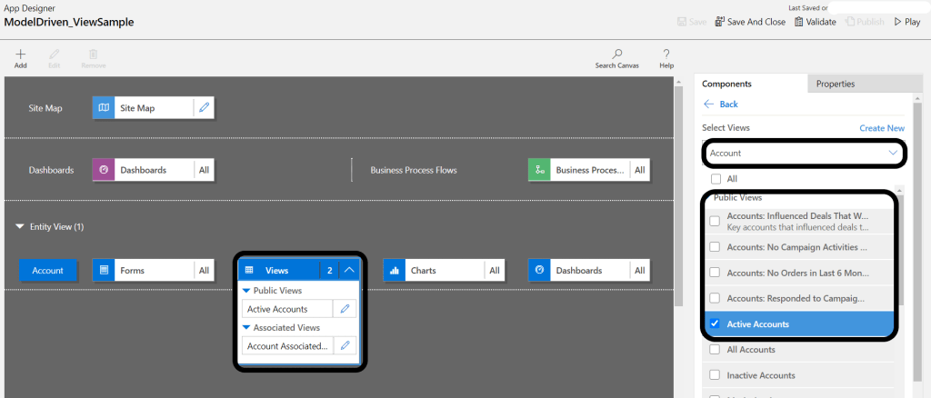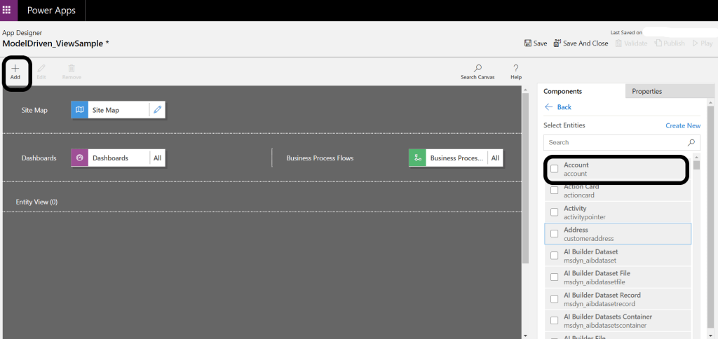 Linke dikkatli bakarsanız bu aşamada sizi Dymanics CRM’e yönlendiriyor. Bu ekran uygulamanıza Site haritası, pano, view, form, chart gibi özellikler ekleyebileceğiniz, tabloları düzenleyebileceğiniz bir ekrandır. +Add butonundan hangi entity veya tablo ile ilgileniyorsak onu seçiyoruz, ben “Account”u seçtim ve Account’un tablosuyla ilgili getirebileceğim view’lar sıralandı.