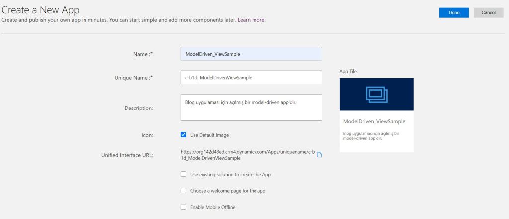 Yazının başında dediğim gibi öncelikle aşağıdaki adresten bir model-driven app oluşturmanız gerekir.