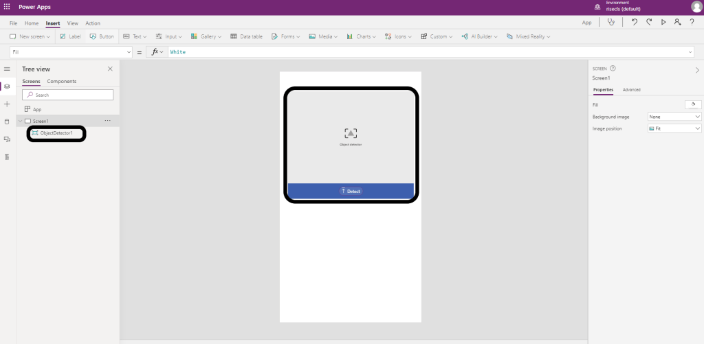 Power App’de iyi bildiğim uygulama geliştirme platformuna yani studyoya geçiyorum. Sayfada hazır şekilde Object Detector componenti karşılıyor beni. Bu bileşen çekilen fotoğrafların veya yüklenen fotoğrafların taramasını gerçekleştiriyor. Bu komponent aslında AI modeli ile birlikte geldi yani AI Modeline bağlanmadan bu bileşeni kullanamazsınız.