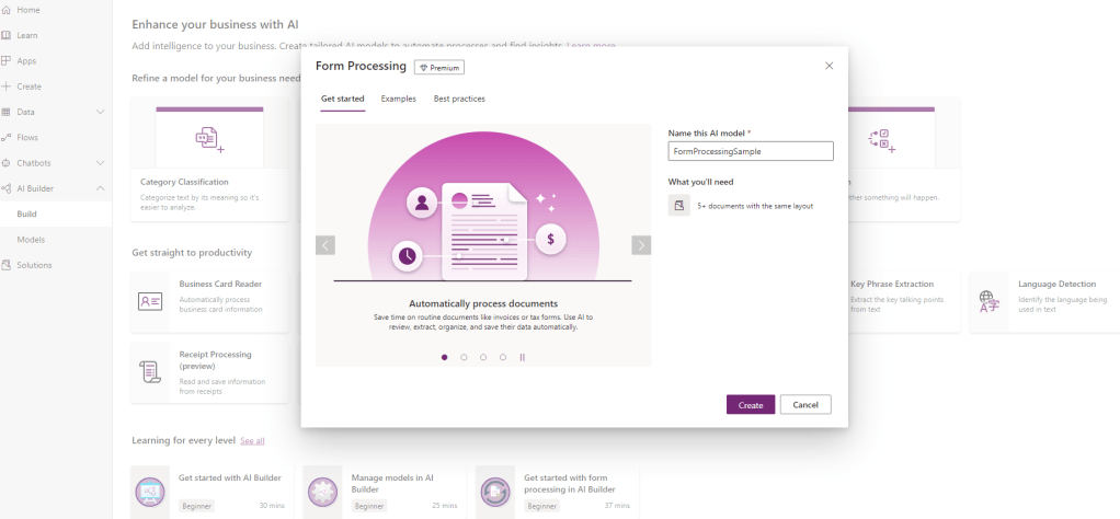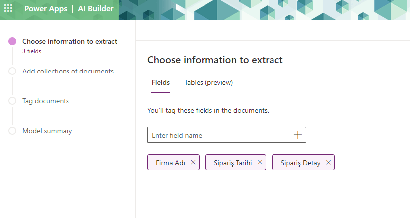 Modelime “Form Processing Sample” adını veriyorum. Modeli oluşturmadan önce aynı şablona sahip 5 adet dokümana ihtiyacınız olduğunu belirtiyor. “Create” diyorum ve modelimi oluşturacağım sayfaya geliyorum. Tıpkı object detection modelde olduğu gibi benden form üzerinde etiket yapacağım alanları burada tanımlamamı istiyor. Hatırlarsanız bir önceki örnekte tam bu adımda erişte çeşitlerini yazmıştım. Şimdi de e-faturada olan bilgileri “Enter Filet Name” ile gireceğim. Modelde ben “Firma Adı”, “Sipariş Tarihi” ve “Sipariş Detay” alanlarını oluşturacağım.