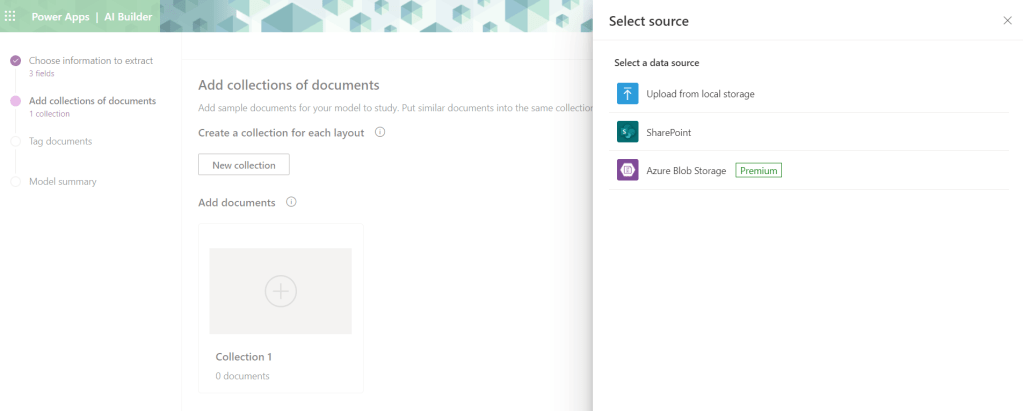 Next’i tıklayıp bir sonraki adıma yani dokmanları yükleyeceğim adıma geliyorum. Burda isterseniz dokümanlarınızı koleksiyon şeklinde gruplandırabilirsiniz ancak her koleksiyon için en az 5 adet dokümana ihtiyacınız olacak. E-fatura örneğim için tek koleksiyon oluşturacağım. Verileri object detection’da olduğu gibi 3 farklı veri kaynağından alabilirsiniz. Ben lokalimdeki verileri kullanacağım.