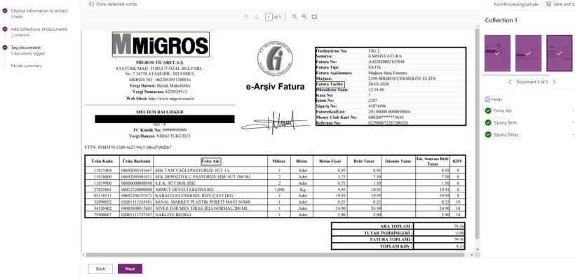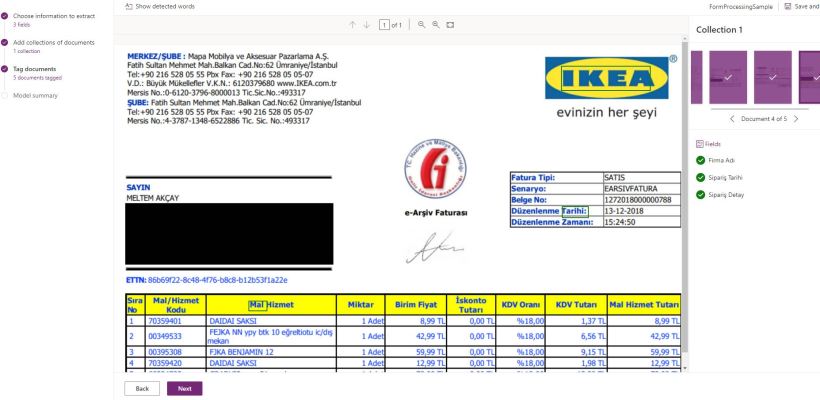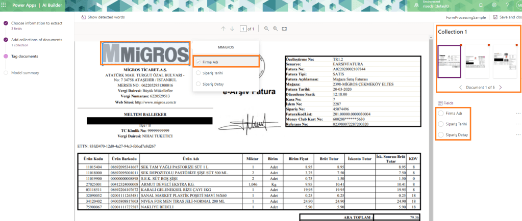 İnternet alışverişlerinden aldığım e-faturalar’dan en az 5 tanesi seçtim ve benim işime yarayacak alanlarını tıpkı object detector model oluştururken yaptığım gibi etiketleyeceğim ve ardından power apps uygulama üzerinden Form Processor ile yüklediğim başka bir faturada benim tanımladığım alanları bulmasını bekleyeceğim.