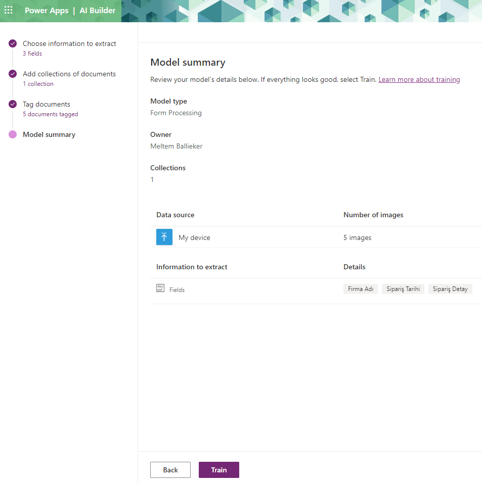 Tek tek tüm faturalarda ilgili alanları etiketledikten sonra tıpkı object detection’da olduğu gibi özet modelimi görüyorum, değiştirmek istediğim adımlara back ile gidip değiştirebilirim. Herşey tamam ise “train” diyorum ve birkaç dakika bekliyorum.