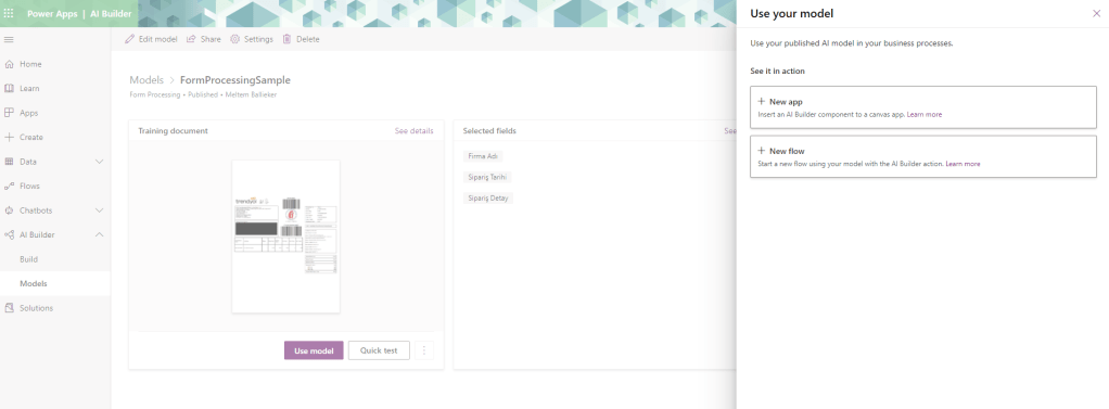 Modellerinizi uygulamalarda kullanmadan önce “Quick test” ile hızlıca test edebilirsiniz, unutmayın “Publish” etmediğiniz bir modeli uygulamada veya Power Automate’de flow oluşturmak için kullanamazsınız.