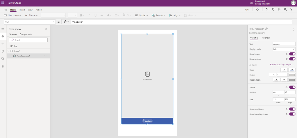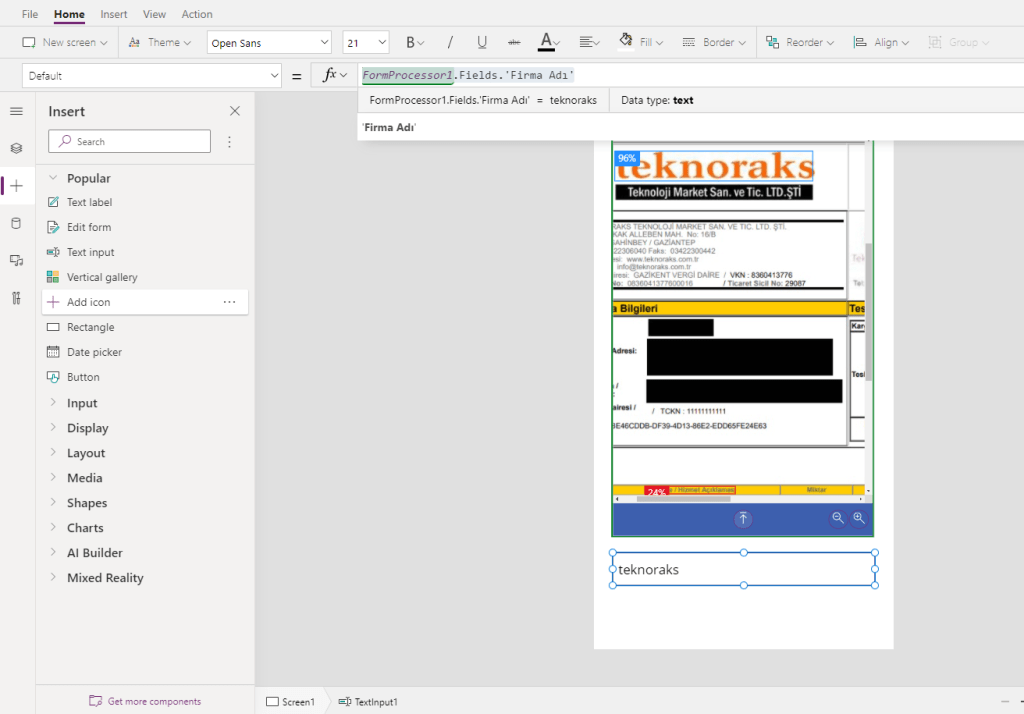 Power Apps Studio’da boş bir canvas app’in içinde Form Processor1 komponenti içine gömülü şekilde oluşturduğum model geldi. Modelin çalıştığını görmek için uygulamayı koşturuyorum ve herhangi bir e-fatura yüklüyorum.