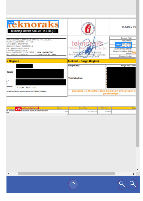 Koleksiyonda etiketleme için girmediğim tipte bir fatura yükledim ve firma adını, sipariş tarihini ve sipariş detay kısmını bana gösterdi.