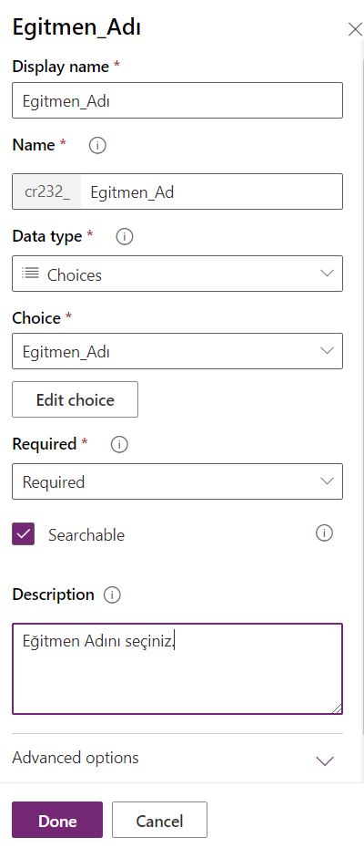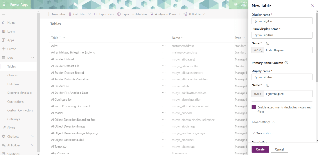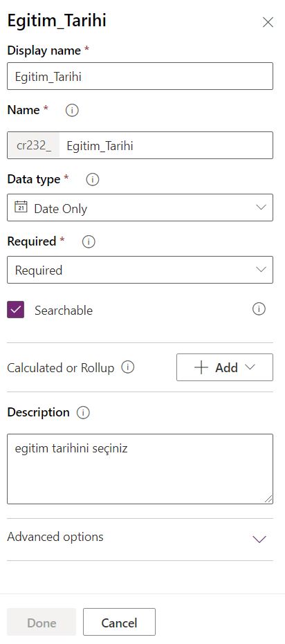 Burada gördüğünüz tüm bu tablolar ve içlerindeki kolonlar yukrıda bahsettiğim Dataverse’ün içinde tuttuğu tablolar. Gelelim bu tabloların dışında Rise Akademi Eğitim tablosunu ve kolonlarını nasıl oluşturacağımıza. Önce tabloyu belirliyorum: tablomun adı Eğitim Bilgileri olsun ve Eğitim ID, Eğitmen Adı ve Eğitim Tarihi kolonlarını içersin. Tabloya doküman ekleyebiliyor olayım. Mesela eğitim ID “Rise:XXXX” koduyla gelsin, eğitmen adı dropdown olsun, vereceğim 3 kişi arasından seçilsin ve eğitim tarihini de takvimden seçip belirleyebieyim gibi birtakım süsler olsun ve bilgi girilmesi zorunlu olsun.