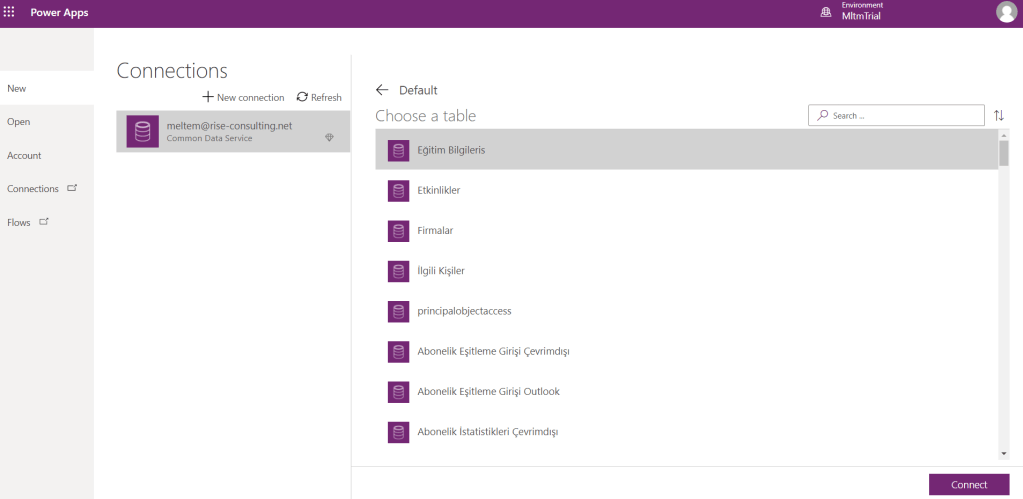 Oluşturduğum Eğitim Bilgileri tablosunu seçiyorum ve bağlanıyorum. Gelen canvas app’in ekran formatını ve ekranda görülmesini istediğiniz kontrolleri istediğiniz gibi ayarlayıp uygulamayı çalıştırdığınızda tablonuza veri girişi yapmaya hazırsınız demektir.