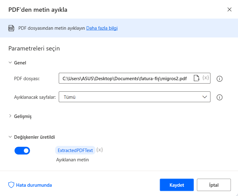 Okunacak PDF’in yolunu ve okunacak sayfa sayısını (veya tümünü) belirtiyorum. PDF’deki metinler değişken olarak atanacak ve adı ExtractedPDFText olacak, isterseniz değiştrebilirsiniz.