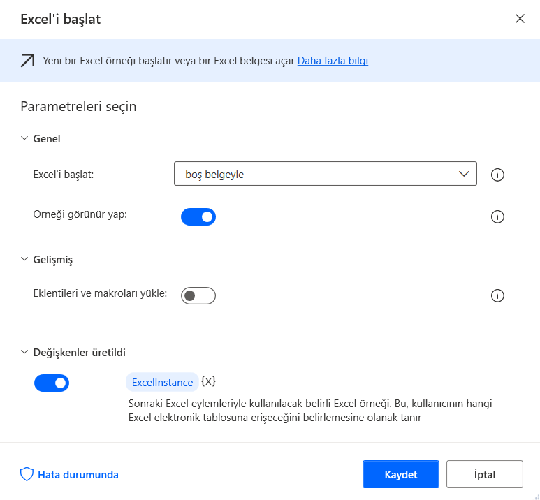 Kaydet dedikten sonra yeni bir excel dosyası oluşturacağım. Bunun için yine search kısmına excel yazıp ilgili “Excel Aç” aksiyonu bulup sürükle bırak ile pdf aksiyonunun altına bırakıyorum. Açılan pencerede “boş belge” açmasını belirtiyorum. PDF’e benzer şekilde atanan değişkene ExcellInstace adı verilecek, isterseniz değiştirebilirsiniz. Ben başka bir yerde kullanmayacağım için isim değişikliğine gitmiyorum.