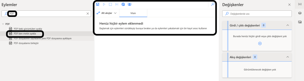 Şimdi örnek olarak herhangi bir pdf uzantılı alışveriş faturasında yazan metinleri excel’de belirttiğim hücreye kopyalayan bir robot tasarlayalım. Bunun için +Yeni Akış ile sıfırdan bir desktop flow oluşturacağım ve adı Fatura_RPA olsun. Eylemler penceresindeki Search’e PDF yazıp PDF ile yapabileceğim action’lardan “PDF’den metin ayıkla”yı akış oluşturduğum alana sürükle bırak ile bırakıyorum.