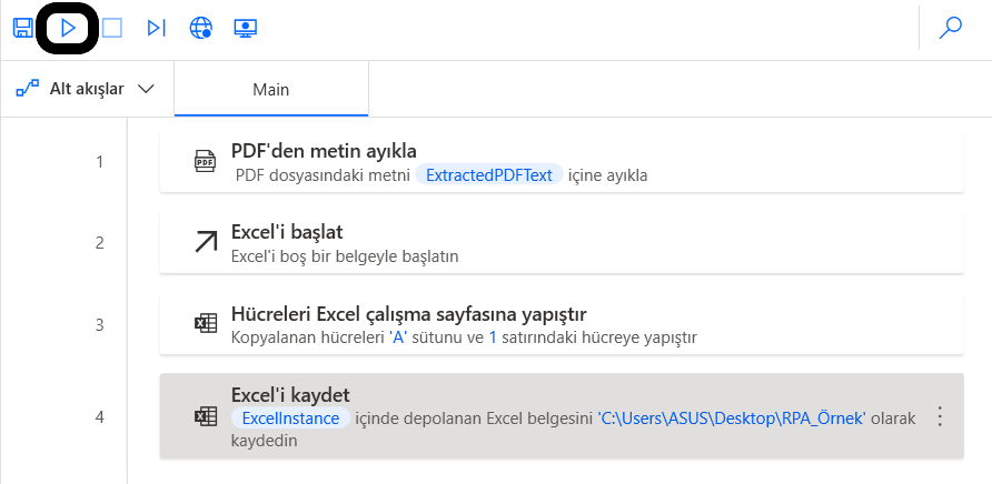 Akışın tüm eylemleri tamamlandıktan sonra önce “kaydet” ile kaydediyorum ardından “run” dediğim de RPA’e öğrettiğim adımların akışını izliyorum.