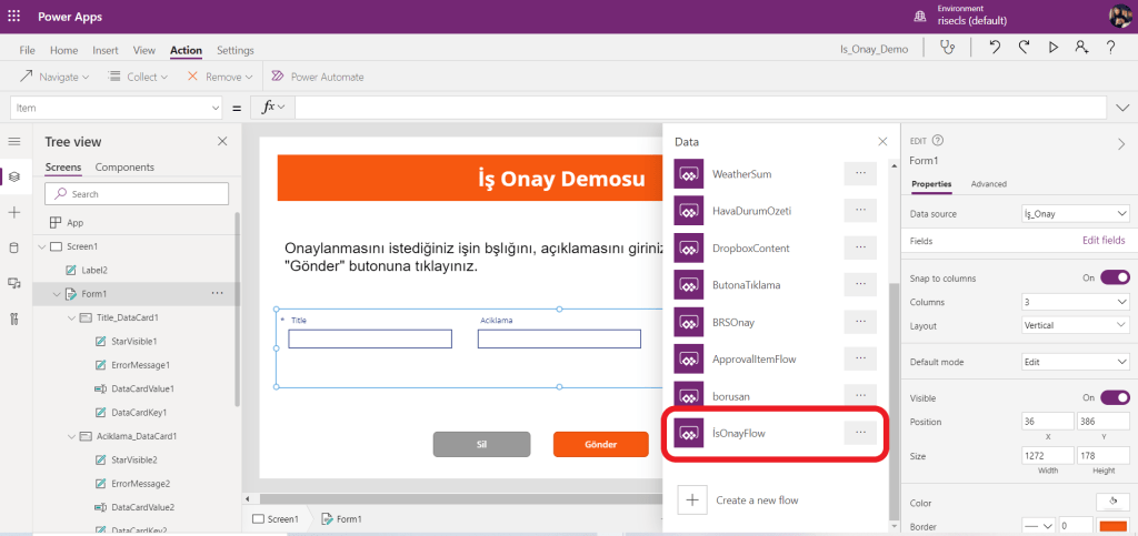 Akışı “Save” dedikten sonra Power Apps’de butona “İsOnayFlow”akışını ekliyorum.