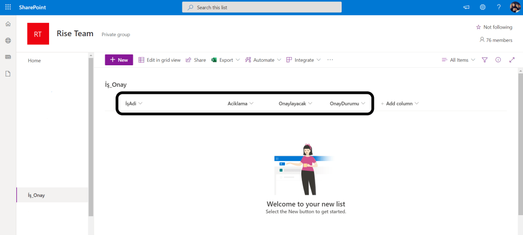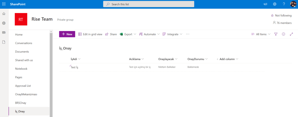 Öncelikle Sharepoint’te bir İş Onay listesi oluşturuyorum. Bu listesde 4 kolon var: İşinAdi, Aciklama, Onaylayan (Person tipinde), OnayDurumu (seçenekleri “onaylandı”,”reddedildi” ve “beklemede” olan bir dropdown)
