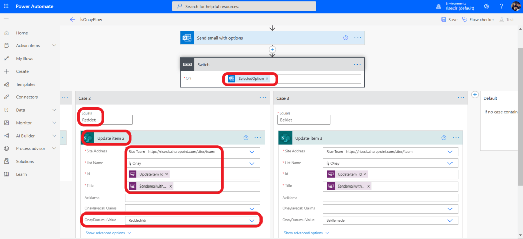 Bir diğer aksiyonum, seçenekleri tanımlamak ve Share Pointte saklatmak. Bu yüzden “Switch Control” aksiyonunu seçiyorum ve mailde sunduğum “Onayla, Reddet, Beklet” seçenekleri için eylemleri belirliyorum.