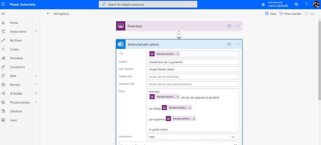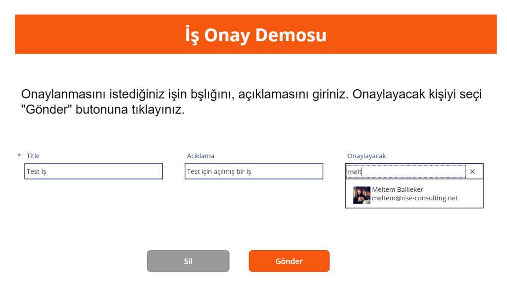 Akışın istediği 5 değişkeni power app’deki kontroller üzerinden tanımladığıma göre artık uygulamayı çalıştırabilir ve dummy bir iş oluşturup onay maili gönderebilirim.