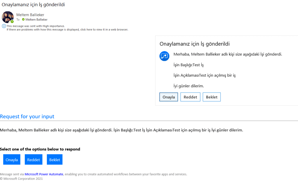Böylece Sharepointten aldığımız forma Canvas app üzerinden Power Automate Flow ile bir onay mekanizması kurduk.