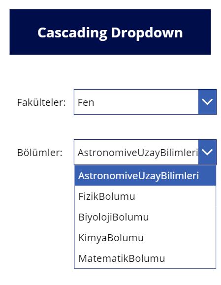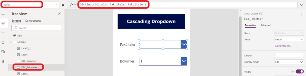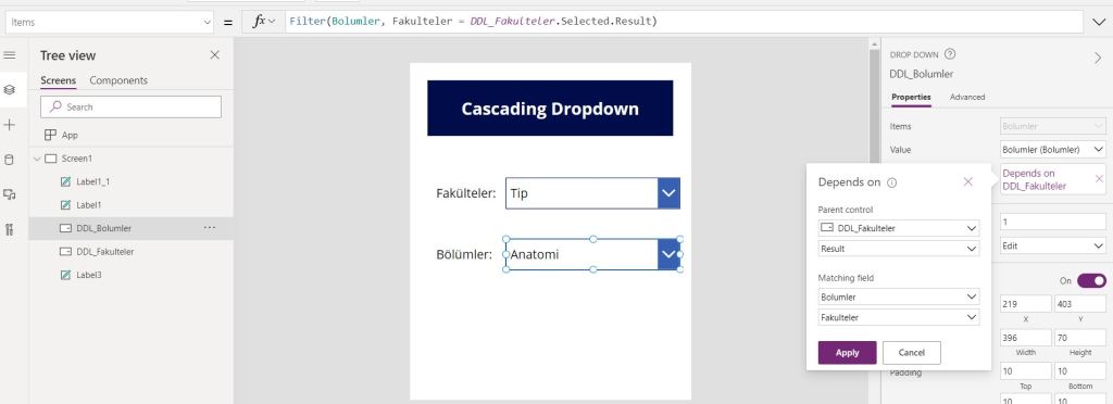 - Formul çubuğuna, DDL_Bolumlerin Items’ına Filter(Bolumler, Fakulteler = DDL_Fakulteler.Selected.Result) yazabilirim.