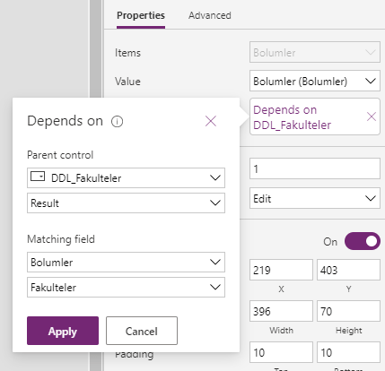 - Properties ekranından yukarıdaki formülü yazmak yerine Depends On üzerinden tabloları seçerek yapabilirim. Burada Parent kontrol bölümleri getireceği fakülte tablosunu ifade etmekte, matching field ise fakülteye bağlı gelecek olan bölümler tablosunu göstermektedir.