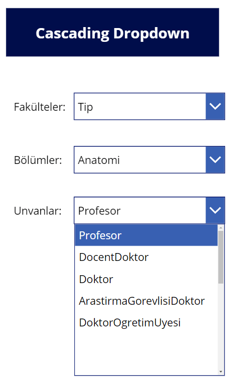 Senaryomuz, üniversitenin kuruluş içi kullandığı bir uygulamada üniversiteye bağlı fakülte ve fakültelere bağlı bölümlerin listelendiği iki adet dropdown üzerine kurulsun. Seçilen fakülteye göre fakültelerin bölümlerinin gelmesini istiyorum.