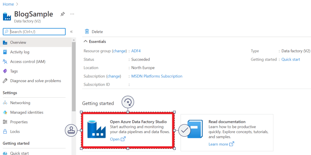 - Oluşturduğumuz data factory’yi seçerek Data Factory Studio’ya geçiyoruz.