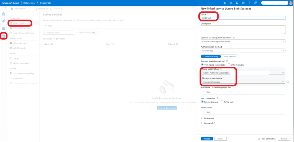 - Azure Data Factory Studio’da sol menüde yer alan “manage” altında Linked Servises ile hem blob storage’ı hem de azure sql db’ye bağlanmamı sağlayacak servisleri tanımlıyorum.