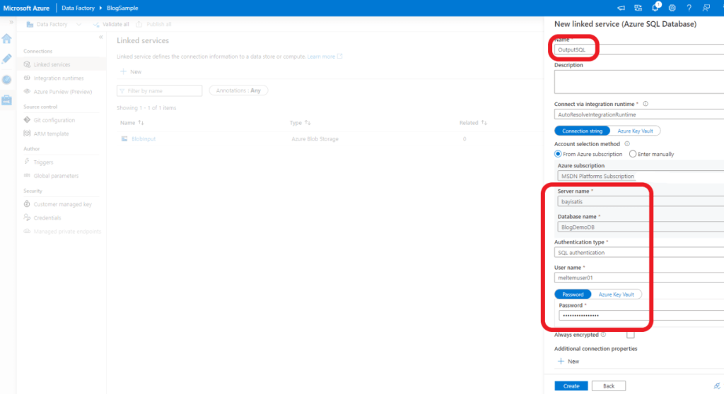 - Benzer şeyi Azure SQL DB için de yapacağım. BlodDemoDB isimli açtığım veritabanına transform ettiğim verileri aktarabilmek için linked servis ile Azure SQL DB’ye bağlanacağım.