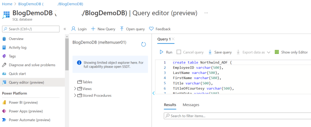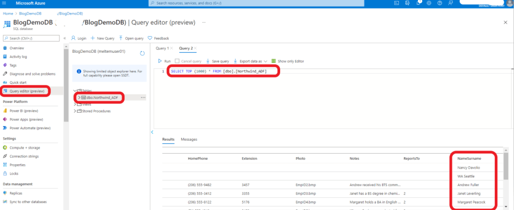 - Başarılı bir şekilde debug edildiğine göre Azure SQlDb tarafına geçip Query Editor’den Northwind_ADF isimli tablomu kontrol ettiğimde Azure Data Factory’de Power Query ile transform ettiğim isim-soy isimleri birleştirdiğim kolonun tabloya eklendiğini görüyorum.