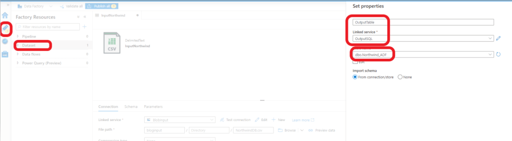 - Şimdi sırada dataset’leri belirleyelim. Sol menüde “Author”dan Factory Resources altında yer alan dataset’e input datasetlerimi ekliyorum. Verileri blob storage’dan alacağım için linked servisim “BlobInput” olacak. Dosyanın bulunduğu yeri “file path” ile belirleyip “create” ile dataseti oluşturuyorum.