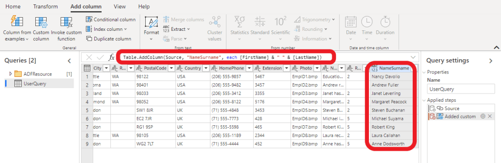 - Burada mesela “FirstName” ile “LastName” kolonlarını birleştirip yeni bir kolon oluşturalım. İster formul çubuğunu kullanarak isterseniz de tab menüden yeni bir kolon oluşturup kolonları birleştirebilirsiniz.