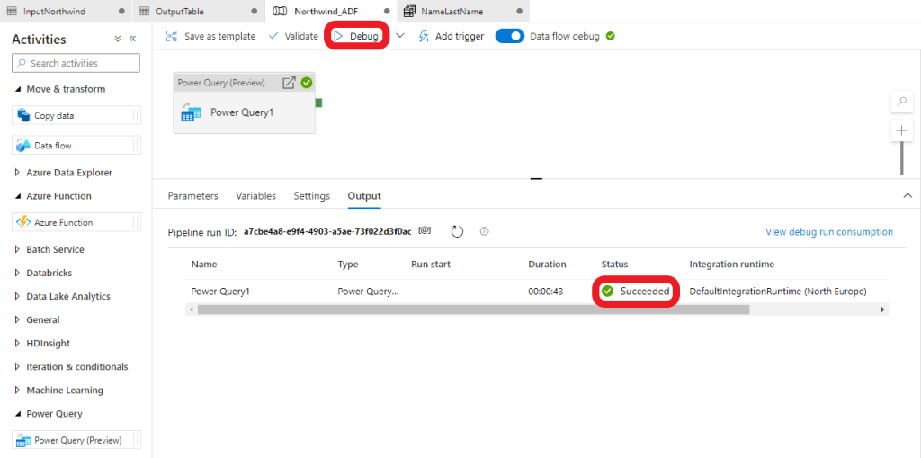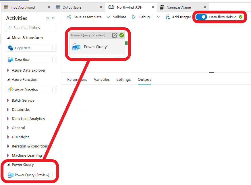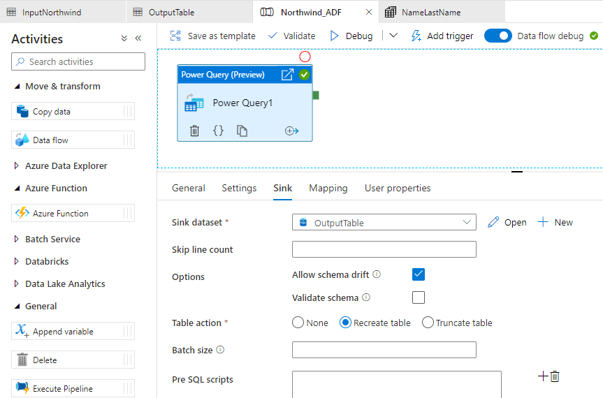 - Sırada yaptığımız değişiklikleri hedef veritabanına aktarmak var. Bunun için önce debug etmemiz gerekmektedir. Bu tür aktiviteleri pipeline üzerinden yapıyoruz. Northwind_ADF isimli pipeline’ıma “NameLastName” isimli query’mi sürükleyip tuvale bırakıyorum ve dataflow debug’ı açık hale getiriyorum.