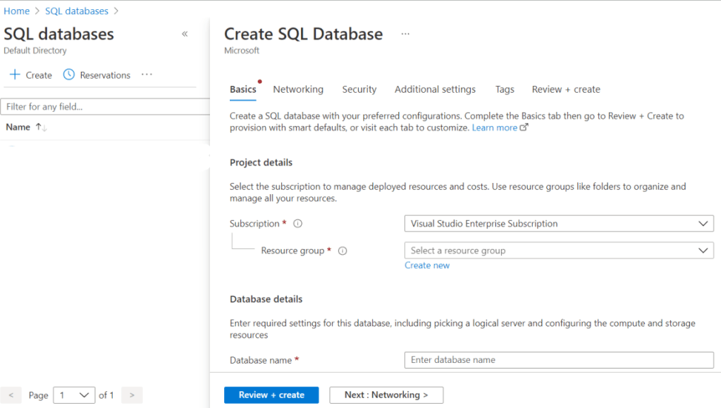 - Verileri Azure SQL DB’de bir database’e aktaracağım için sırada Azure SQL DB oluşturmak var. Adımları takip ederek istediğiniz configurasyonlarda DB oluşturabilirsiniz.