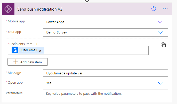 Senaryomuz Power Apps ile hazırladığımız Demo_Survey adlı uygulamaya yeni sürüm geldiğini push notification ile kullanıcılara haber vermek olsun. Push notification için Power Automate Cloud Flow kullanacağım.