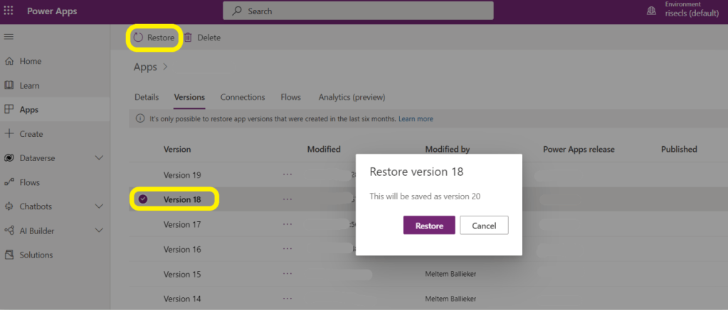 herhangi bir yanlış adımda bir önceki versiyona dönmek için Power Apps Studio’dan gideceğiniz adres;