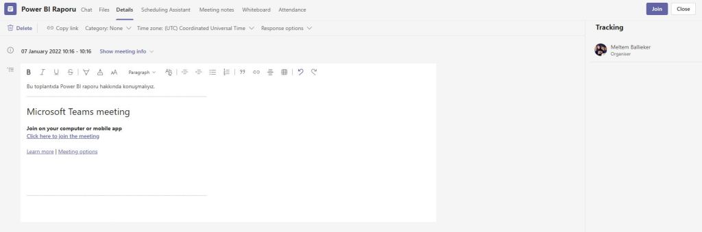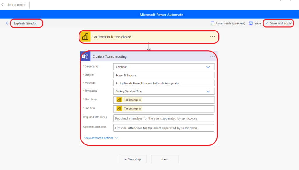 Flowuma “Toplantı Gönder” adını verdikten sonra aksiyonu otomatik olarak Power BI butonunun tıklanması şekilde gelmişti. Bir diğer aksiyon olarak Teams Meeting’i seçtim ve kendi isterlerime göre mesaj ve subject kısmını özelleştirdim. Bu alanlarda dinamik içerik de kullanabilirsiniz.