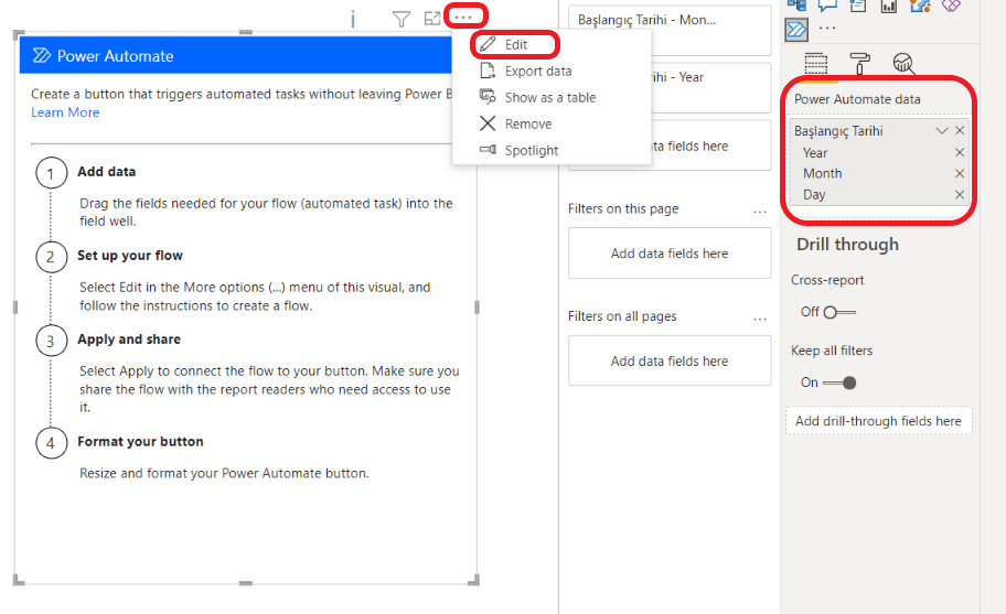Flowu eklediğimde rapor sayfasında bir flow penceresi açılıyor. Tıpkı Power BI’da diğer görsellerde yaptığım gibi flow oluşturmak istediğim verileri Visuallization Panel‘deki Fields kısmına sürükleyip bırakıyorum. Böylece penceredeki 1.adımı gerçekleştirmiş oluyorum. Bu örnek için Başlangıç Tarihi’ni Power Automate Data alınan aktardım.