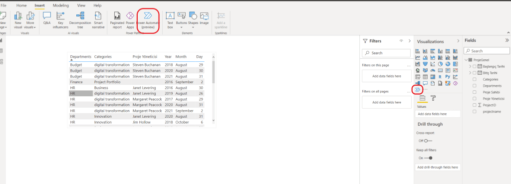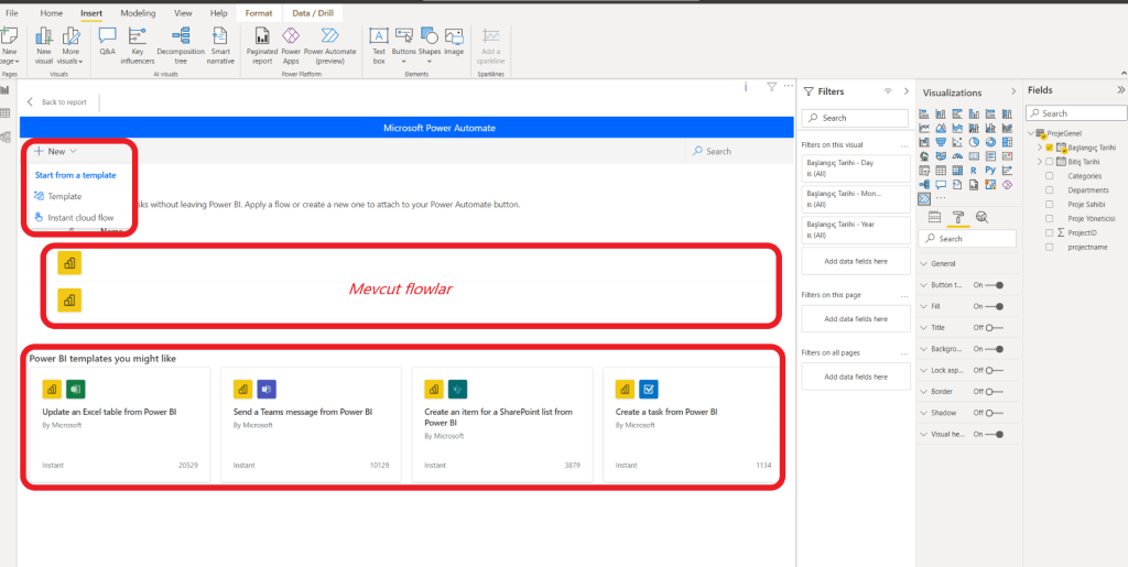 Flowu raporunuza iki yerden ekleyebilirsiniz: Tab menüde yer alan Insert menüsü içinden Power Automate‘i seçerek veya Rapor sayfasındaki Görseller penceresinden flow ikonunu tıklayarak.