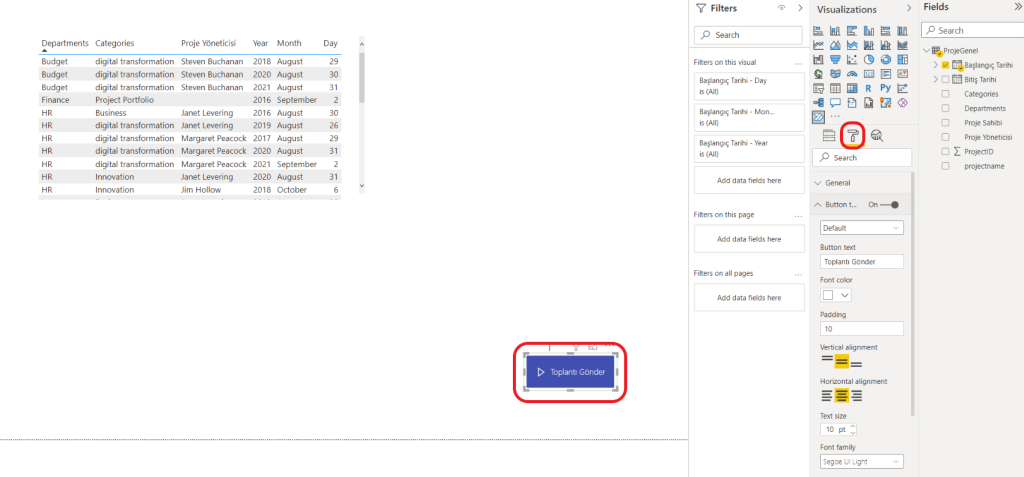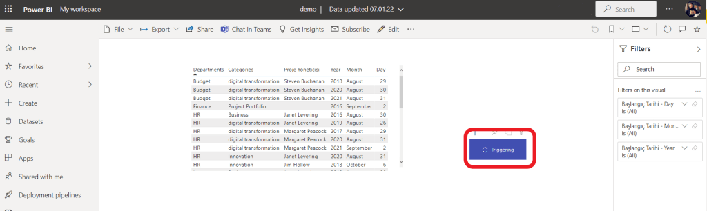 Bir hatırlatma! Bu butonu kullanabilmeniz için butonun cloud ortamına çıkması gerekir. Dolayısıyla bu raporu Power BI Service kısmında publish etmeden butonlar çalışmaz. Raporumu yayınladıktan sonra butona bastıyorum ve flow tetikleniyor (triggering).