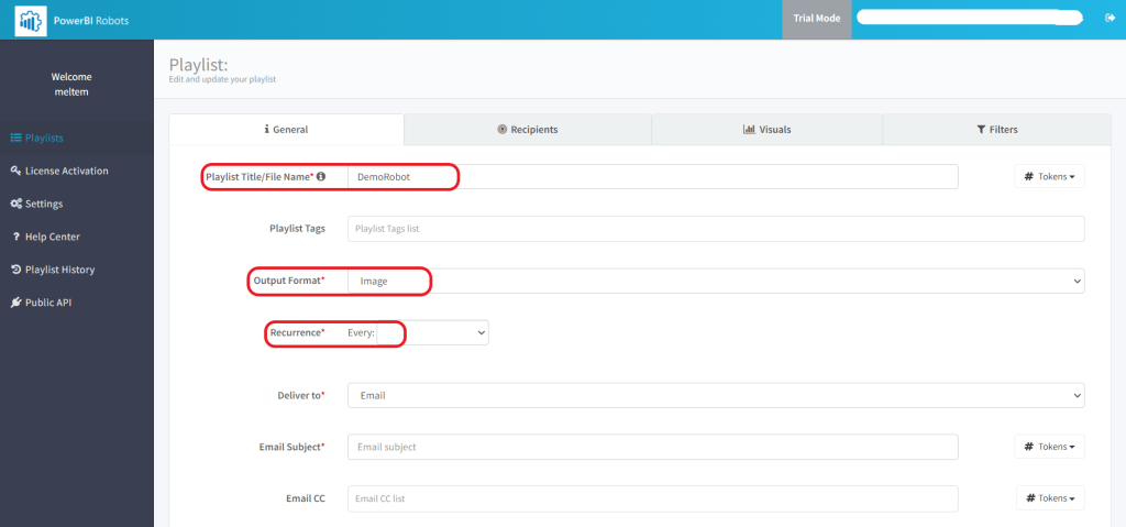 Tab menüde Playlistin genel özellikleri, alıcı bilgileri, ekran görüntüsü alınacak görselleri ve filtreleri bulabilirsiniz. Sırasıyla bu menüyü takip edeceğiz.
